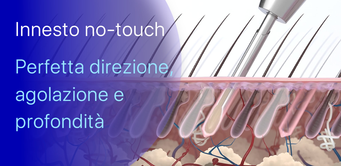 L’innovativo innesto no-touch, senza manipolazione dell’Unità Follicolare, evita il traumatismo dei vecchi metodi d’innesto. Le UF vengono alloggiate, con la perfetta profondità e angolazione, direttamente nei canali aperti con la Punta Diamond.