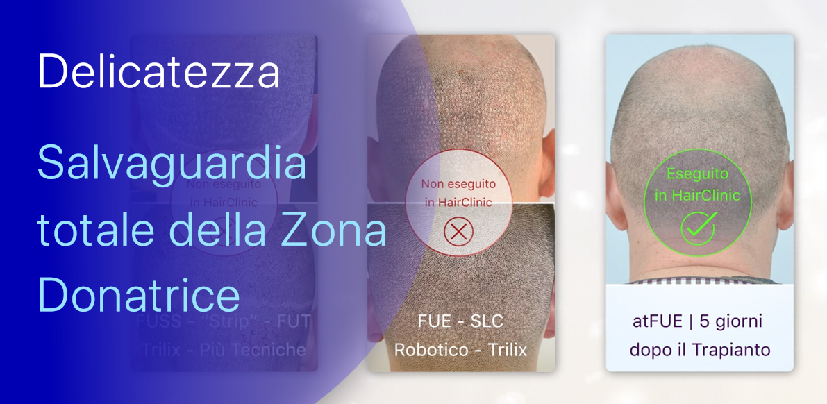 La delicatezza della tecnologia atFUE non ha eguali. Offre la massima conservazione della Zona Donatrice e il minor impatto possibile. Grazie alle sue peculiarità le tracce del Trapianto sono impercettibili.