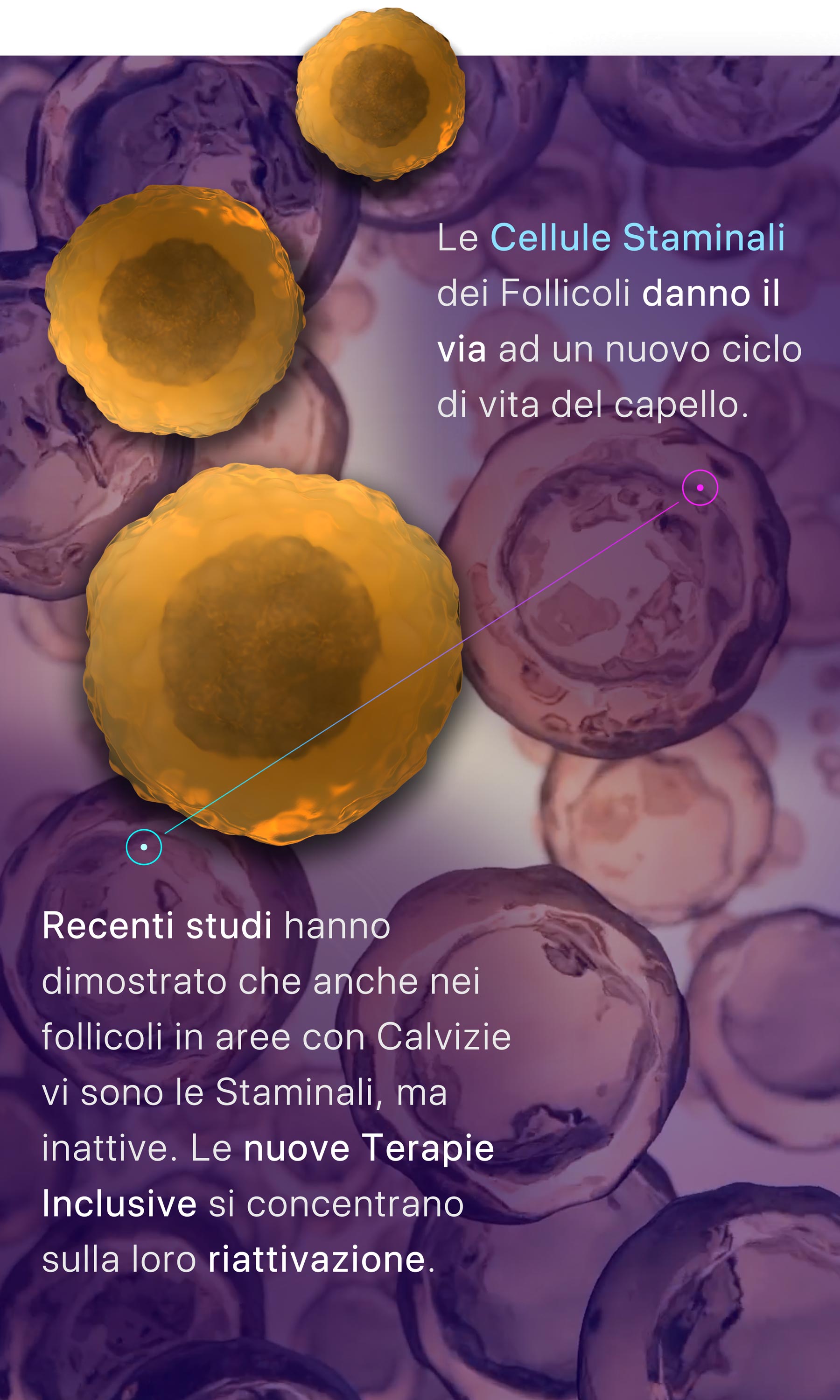 Grazie a speciali Cellule del Bulge e alle DPCs che formano la Papilla Dermica, sostengono e regolano la progressione del ciclo del Capello e la formazione del Follicolo. Grazie a Terapie avanzate oggi possiamo eseguire Protocolli che sfruttano le immense capacità rigenerative delle nostre Cellule.