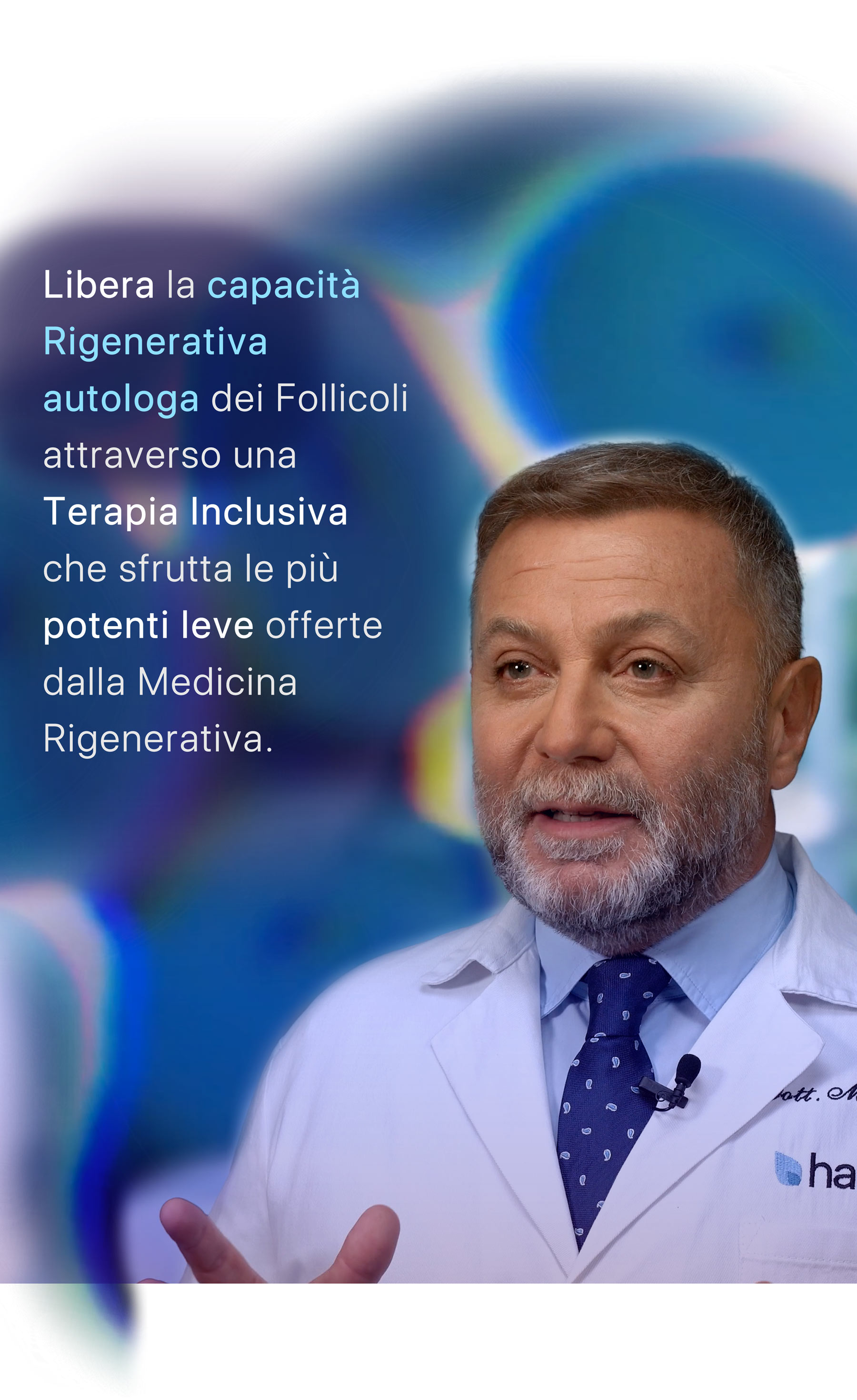 Grazie alla Medicina Rigenerativa Inclusiva è alla Terapia Inclusiva è possibile agire a 360 gradi sulla Calvizie e promuove le migliori condizioni di salute necessarie per favorire un recupero del parco follicolare attivo.