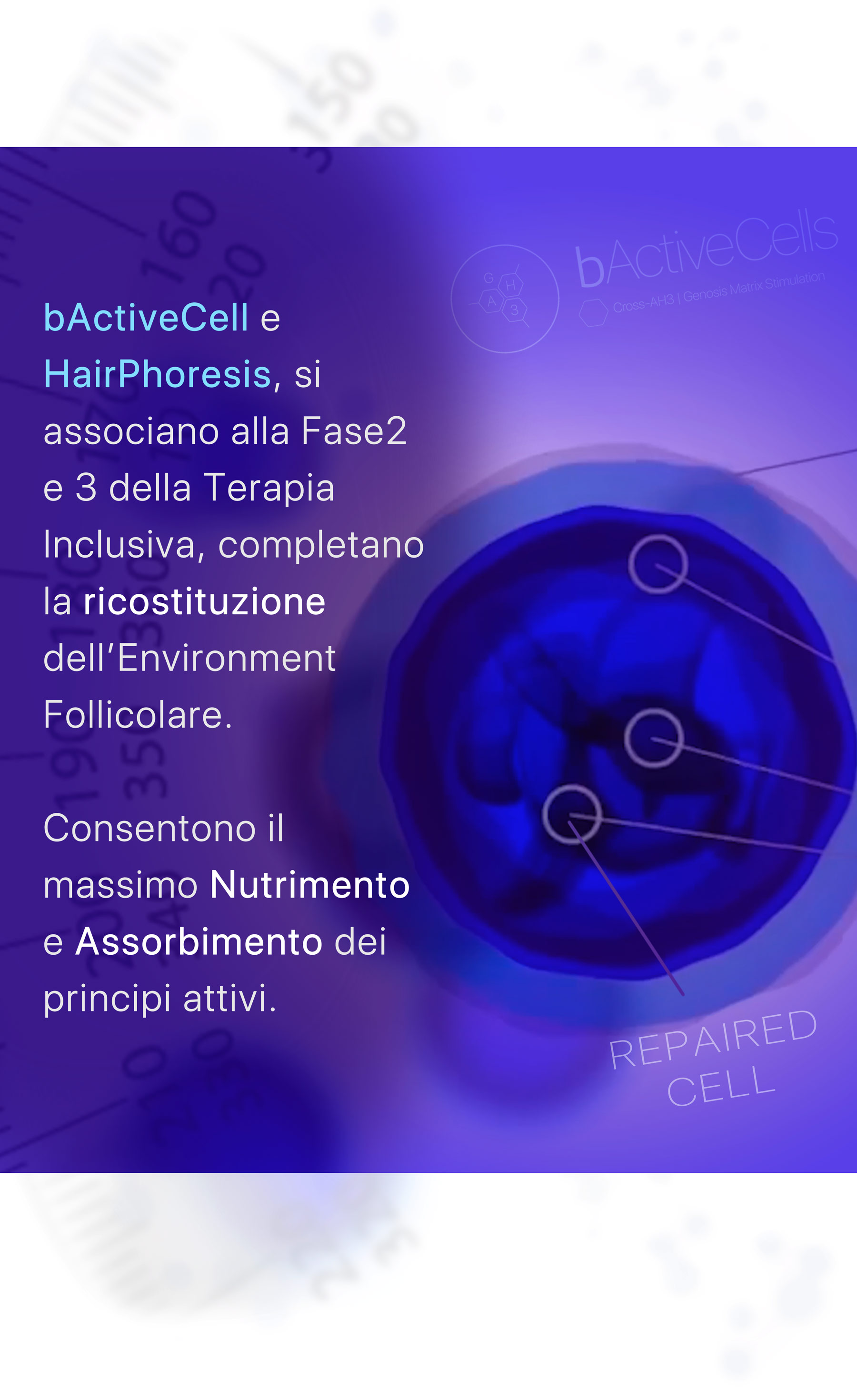 La Terapia bActiveCell, è dedicata proprio al ripristino di questi valori nutrizionali e funzionali, è composta da attivatori nanosomici frutto delle ultime ricerche scientifiche e genomiche finalizzate ad apportare i massimi nutrienti ai Follicoli e alle Cellule della cute.