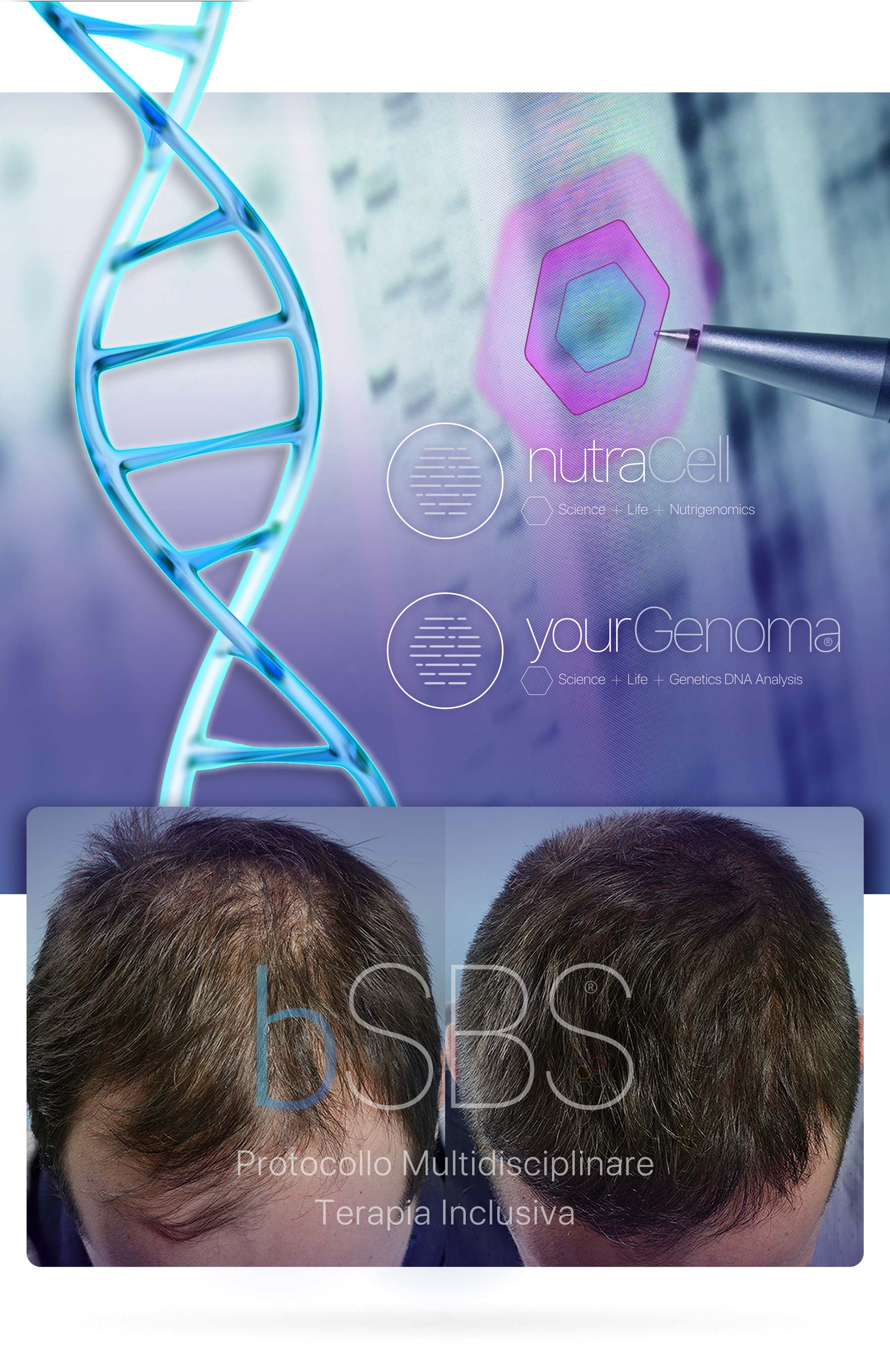 L’associazione tra Genomica e Medicina Rigenerativa offre l’opportunità unica di intervenire, con precisione assoluta, sulle cause e concause delle patologie legate in parte o totalmente anche alla tua Calvizie.
