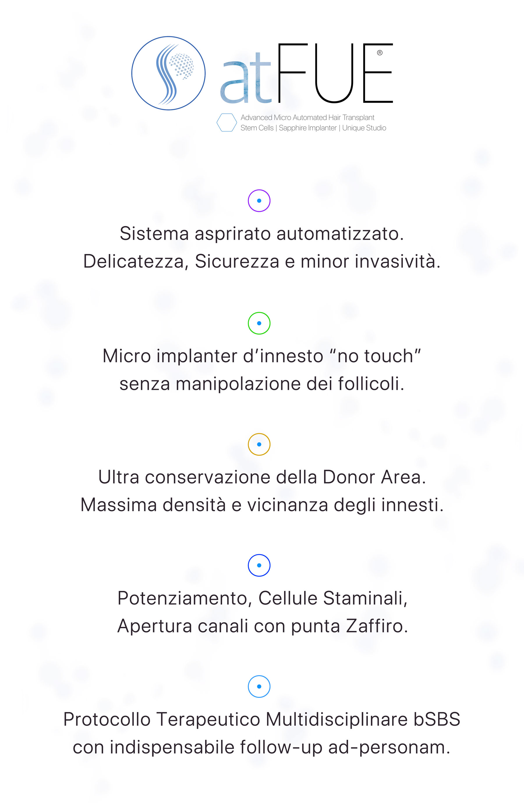 * In HairClinic atFUE è eseguito solo dopo aver creato le migliori condizioni cliniche nel Paziente riferite a cute e Follicoli. Include tutte le 5 Fasi del Protocollo Multidisciplinare bSBS e la Terapia Inclusiva. Senza questa fase terapeutica essenziale, non avrebbe molto senso eseguire il tuo primo o successivo Trapianto di Capelli. E necessaria valutazione dal vivo per l’idoneità all’esecuzione del Trapianto atFUE.