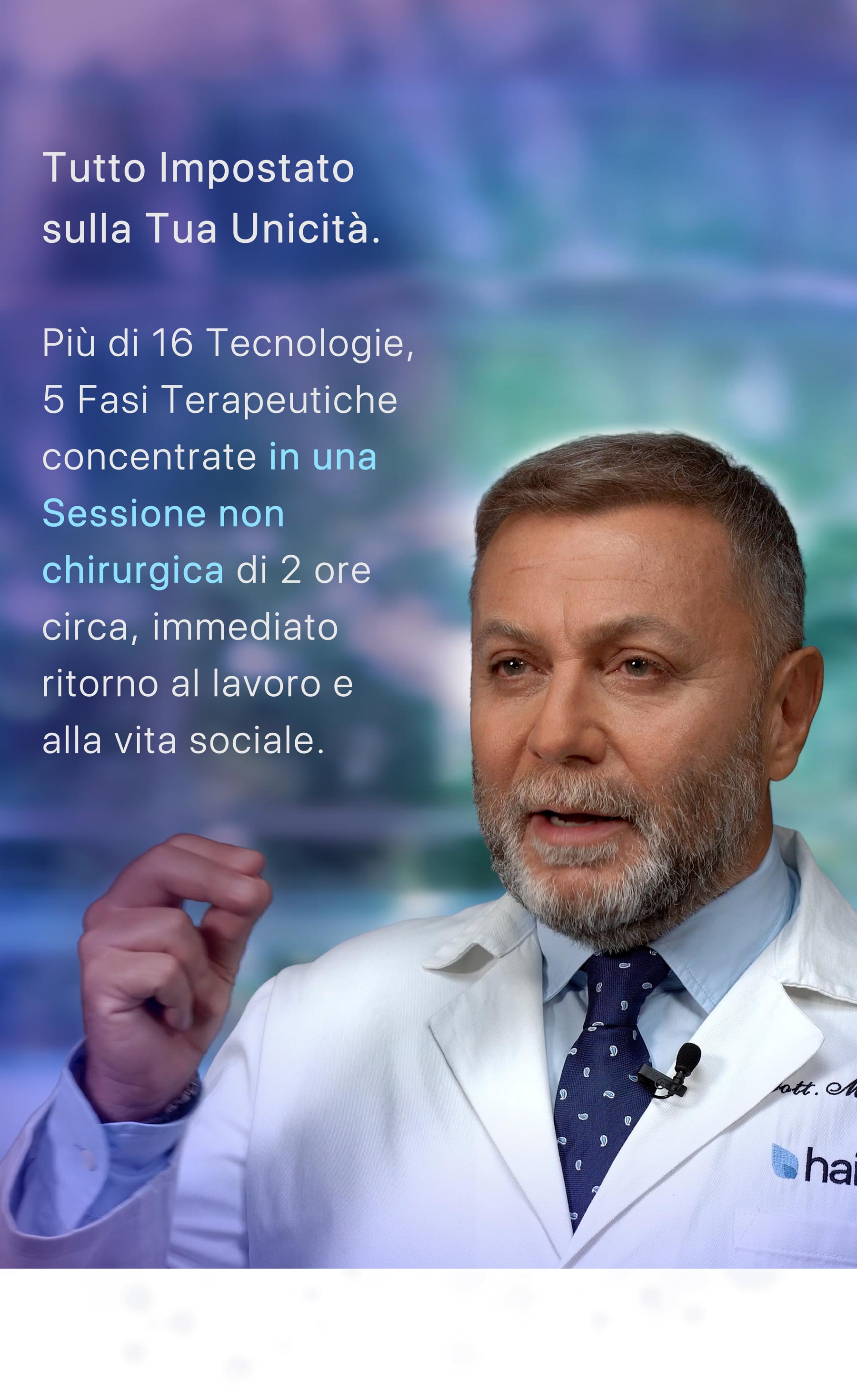 Il Protocollo prevede una Sessione Terapeutica ad alta densità nella quale si alternano più di 16 tecnologie in grado di avvolgere la Calvizie nella sua totalità.
